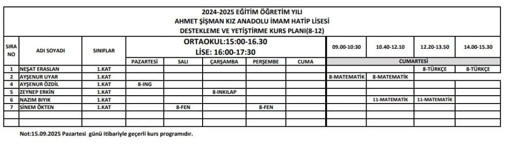 15.09.2025 Pazartesi Günü itibariyle geçerli kurs programımız